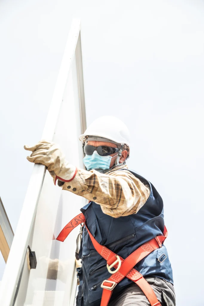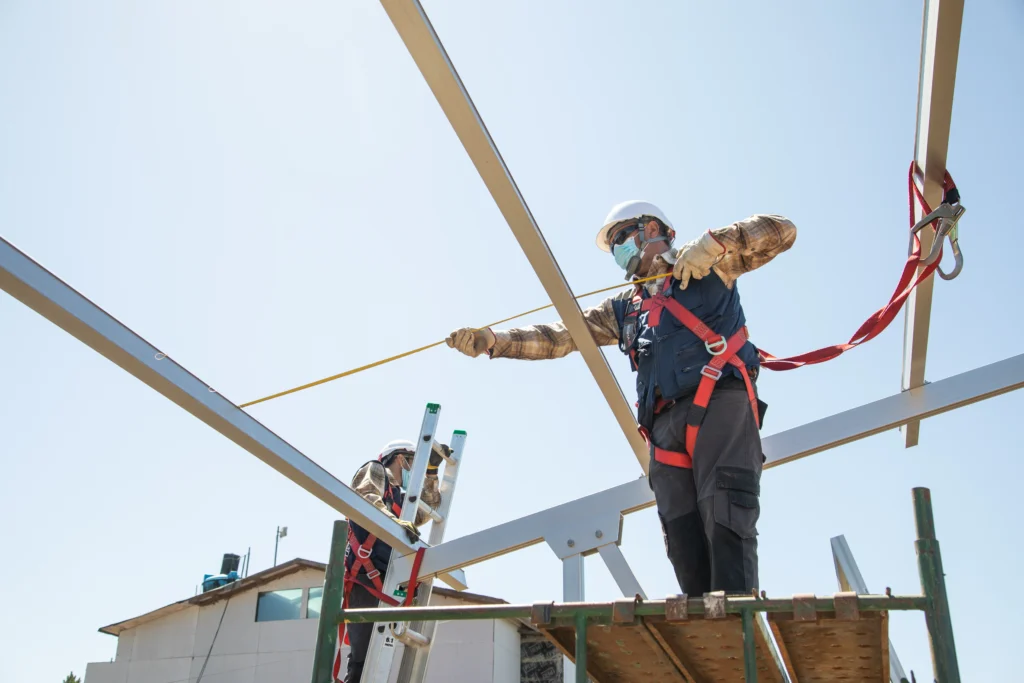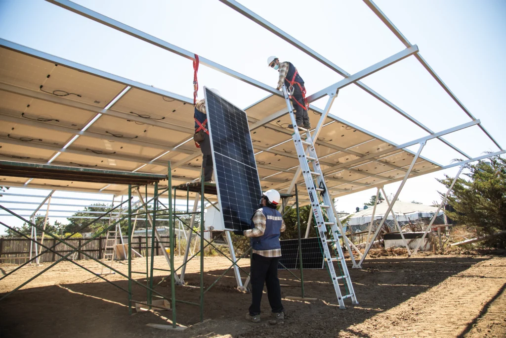 José Pérez, uno de los técnicos solares de Rising Sun ajusta la instalación de los paneles en la planta solar de la Fundación Punta de Lobos. Rising Sun es una empresa B especialista en energía solar. Punta de Lobos, Chile. Foto: Oscar Fredes
